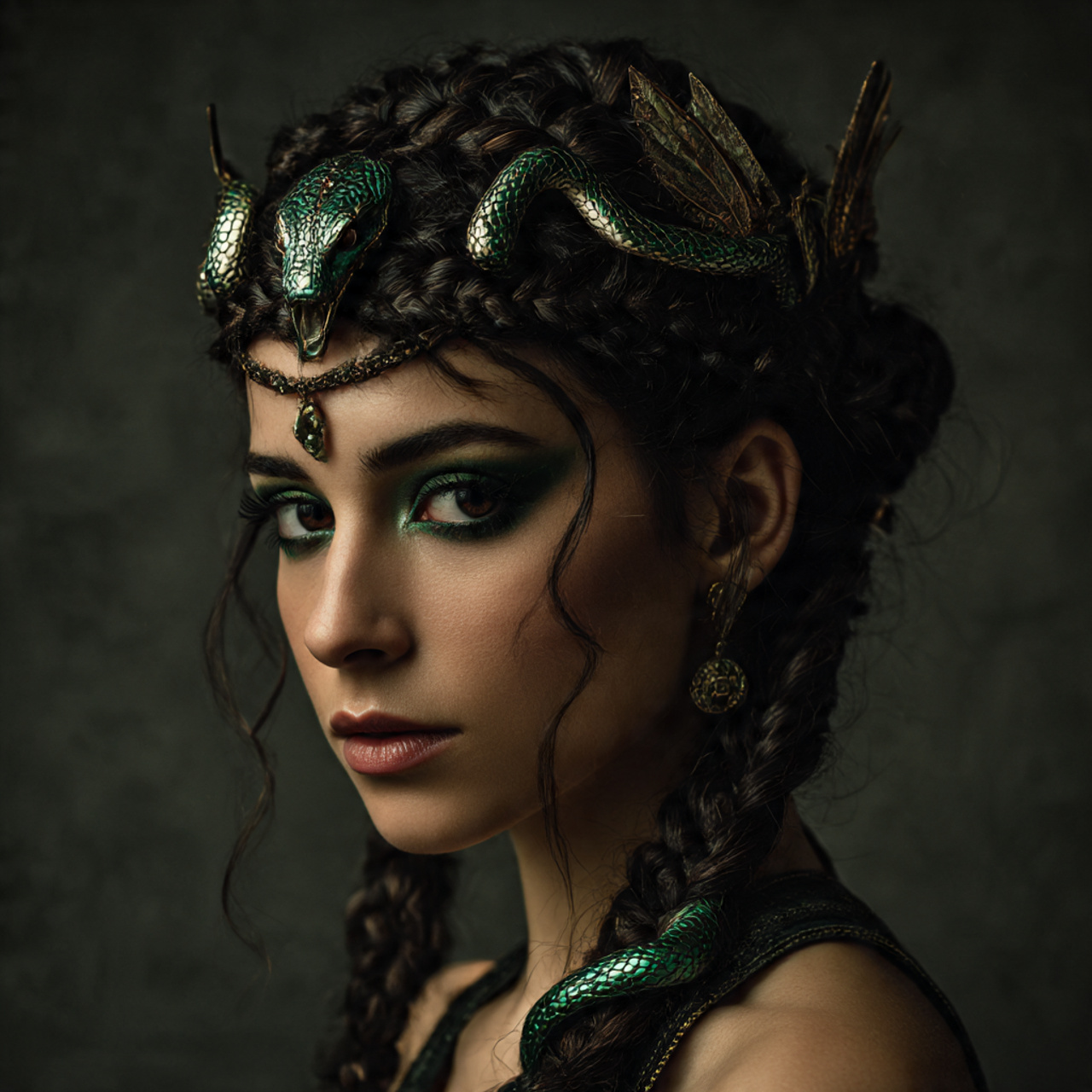 The hair itself should be textured and slightly wild, supporting the weight and shape of the serpentine additions without looking too clean. A touch of metallic green or gold dust across the braids adds an ancient, stony finish to the overall effect.