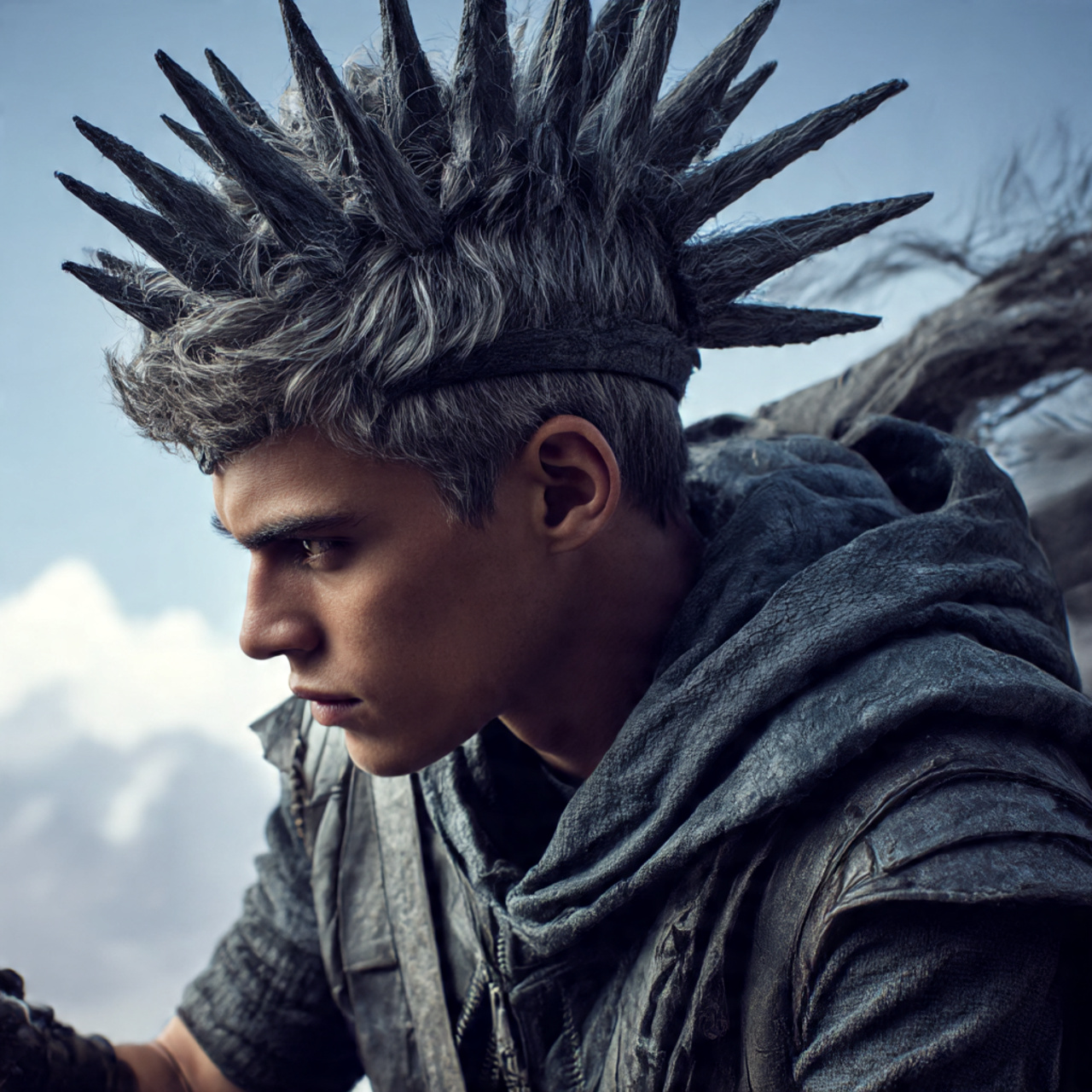 This look channels the brutal, functional style of a post-apocalyptic fighter or a monstrous creature from a dark fantasy. The hair is heavily textured, choppy, and sculpted into hard, uneven spikes that point in various, aggressive directions.